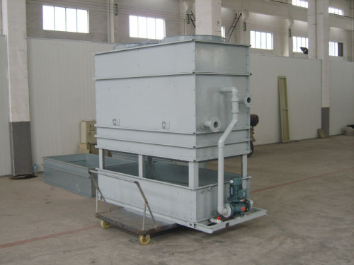 閉式冷卻塔是將管式換熱器置于塔內(nèi),通過流通的空氣、噴淋水與循環(huán)水的熱交換保證降溫效果。由于是閉式循環(huán),其能夠保證水質(zhì)不受污染,很好的保護了主設備的高效運行,提高了使用壽命。外界氣溫較低時,可以停掉噴淋水系統(tǒng),起到節(jié)水效果。閉式冷卻塔實際上是一種蒸發(fā)式冷卻塔,冷卻器和濕式冷卻塔的組合,它是臥式的蒸發(fā)式冷卻塔,工藝流體在管內(nèi)流過,空氣 在管外流過,兩者互不接觸。閉式冷卻塔是傳統(tǒng)冷卻塔的一種變形和發(fā)展。塔底蓄水池內(nèi)的水由循環(huán)泵抽取后,送往管外均勻地噴淋下來。與工藝式流體熱水或制冷劑和管外空氣并不接觸,成為一種閉式冷卻塔,通過噴淋水增強傳熱傳質(zhì)的效果。